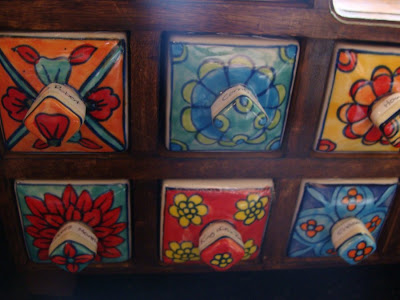 When I first saw this cabinet, I thought "the herbs!" ....then I started to really think hard about it all. Timber's are usually impregnanted with varnishes/stains or anti-pest solutions. Not always, but you can't be sure. We bought a handsome kitchen cabinet and it was made with that same Asian timber and influence. I had to contact the company about what products had been used on them previously, before re-covering it with a new varnish made of natural ingredients, it was then I discovered that they had only used a natural, beeswax solution.Not wanting to let go the herb idea, I wondered how I could be cautious with this yet still have something that would help me in quickly getting my brews together each day. Then I thought I could stretch glad-wrap over the top of each draw. Maybe that would prove just as difficult..lifting the wrap each time, but it hasn't, which is great.